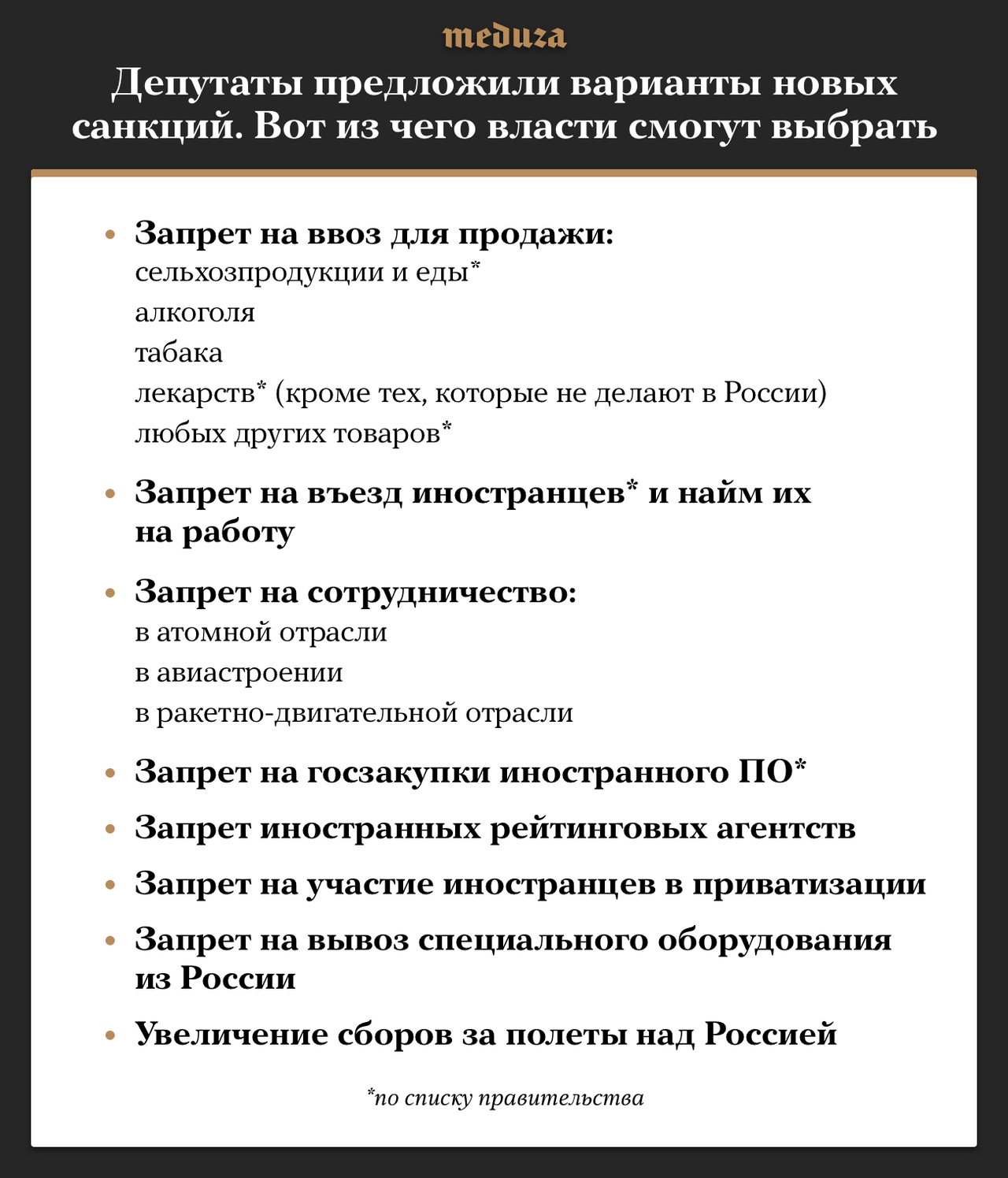Законопроект, предлагающий позволить правительству и президенту России вводить санкции против США и союзников в ответ на «недружественные действия», был внесен в Госдуму 13 апреля спикером Вячеславом Володиным и лидерами думских фракций. Вот что они смогут запрещать в случае принятия закона: