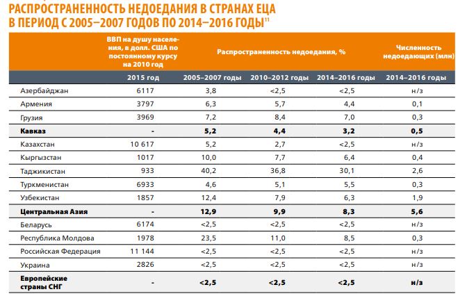 В целом, подчеркивают аналитики ФАО, распространенность недоедания в странах ЕЦА невысока. «В период с 1990 по 2015 год регион в целом достиг огромных успехов в сокращении как процентной доли, так и абсолютного числа голодающих. Тем не менее, в нескольких странах ЕЦА распространенность недоедания остается сравнительно высокой. Наиболее высокий уровень этого показателя зарегистрирован в Таджикистане», — отмечается в докладе.