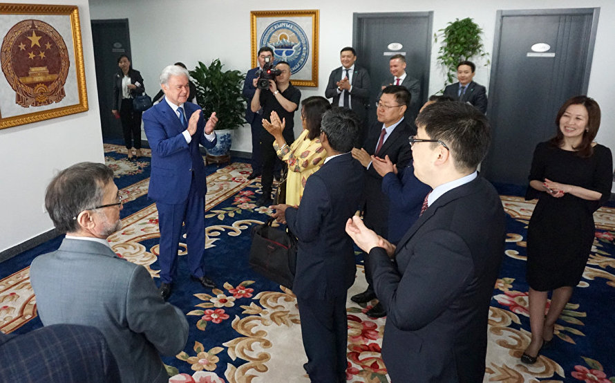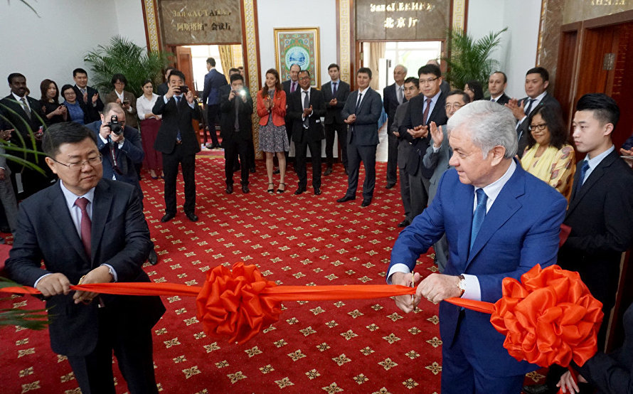 Красную ленту разрезали Генеральный секретарь ШОС Рашид Алимов и Специальный представитель правительства Китая по делам ШОС, Национальный координатор Китая посол Сунь Лицзе.