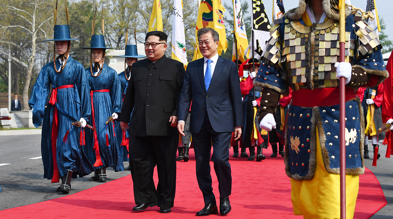 Ким Чен Ын стал первым северокорейским лидером, пересекшим южную границу КНДР с окончания войны в 1953 году. 27 апреля в деревне Пханмунджом, расположенной в демилитаризованной зоне, он ведет переговоры с президентом Южной Кореи Мун Чжэ Ином. Это первая встреча между руководителями двух Корей, которая проходит на территории Южной Кореи. Предыдущие встречи между главами двух Корей в 2000-м и 2007-м году проходили на территории Севера, и ни к каким результатам не привели.