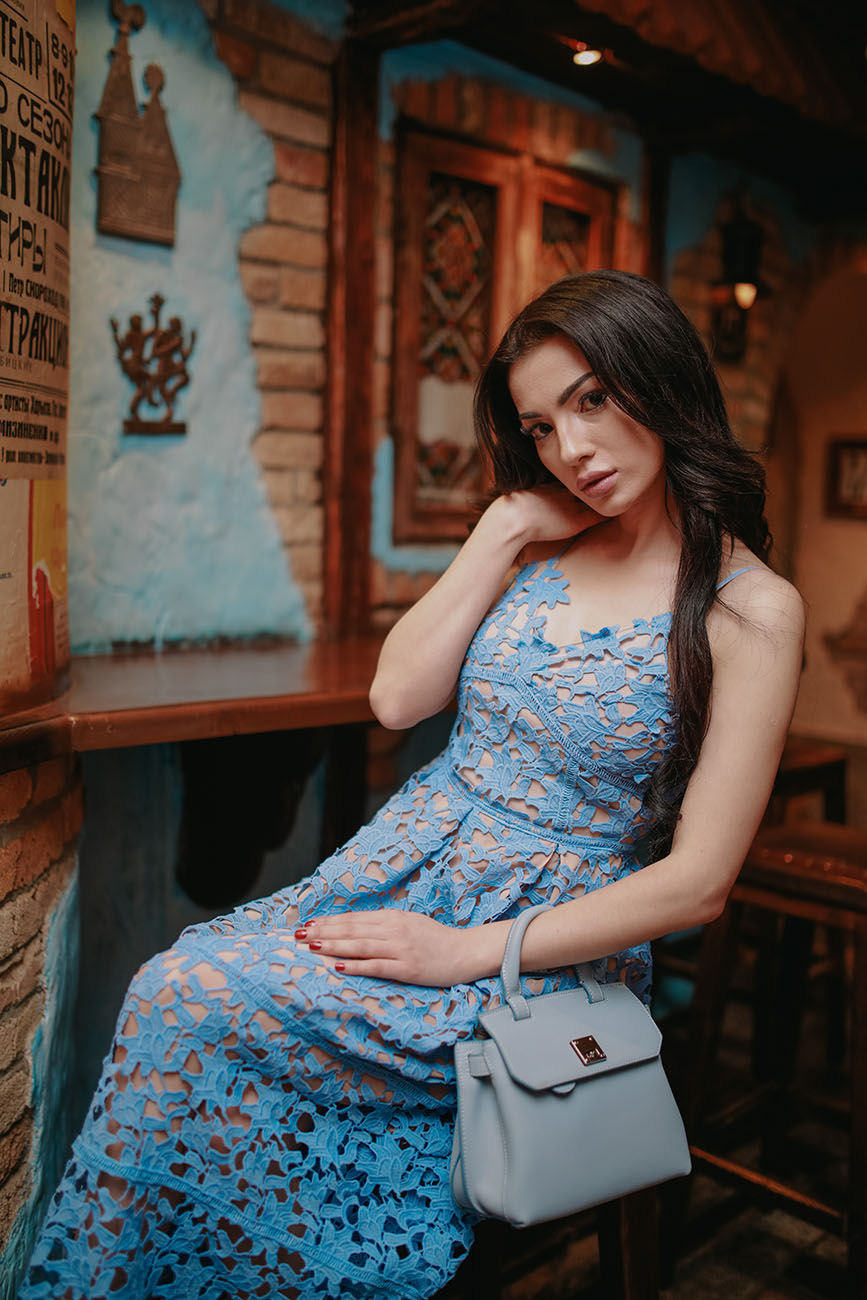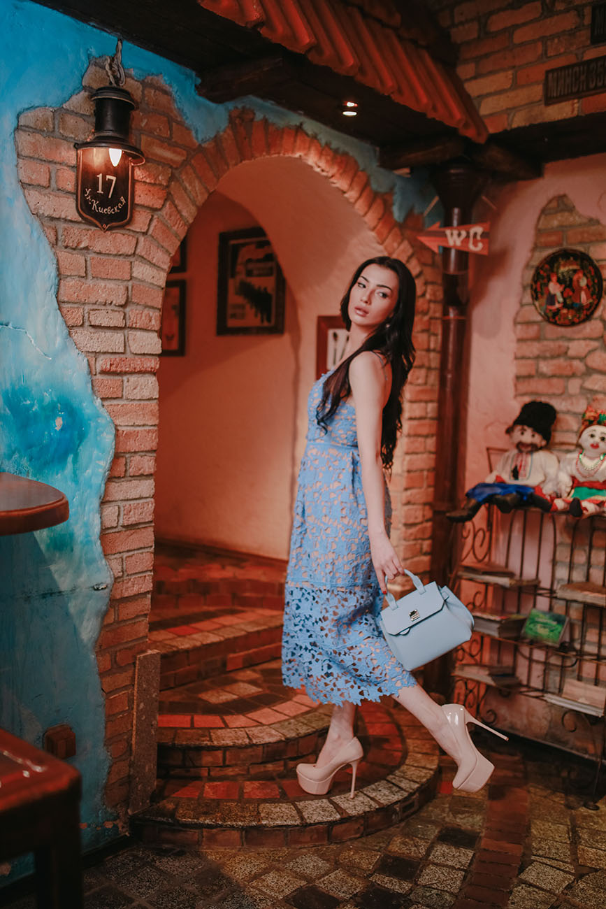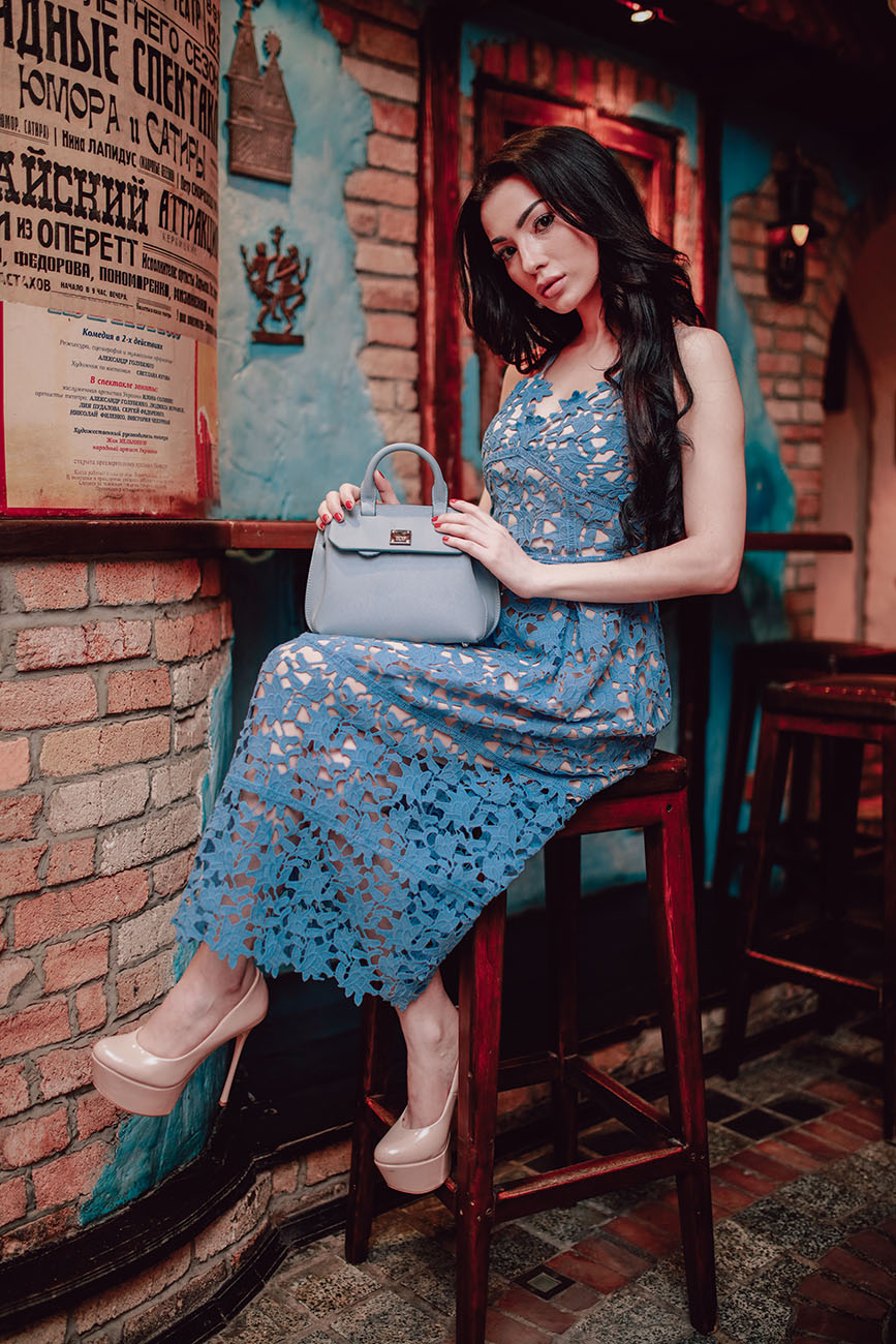 Кружево в 2018 году получило звание главного тренда года. Трепетное коктейльное платье длины миди, выполненное из кружева голубого цвета, говорит об интеллигентности и романтичности его обладательницы. Такое изящное платье сочетается с нежными и аккуратными аксессуарами, небольшими сумочками нежных пастельных тонов. Надевать кружевное платье лучше к туфлям на высоком каблуке, босоножкам или лодочкам.