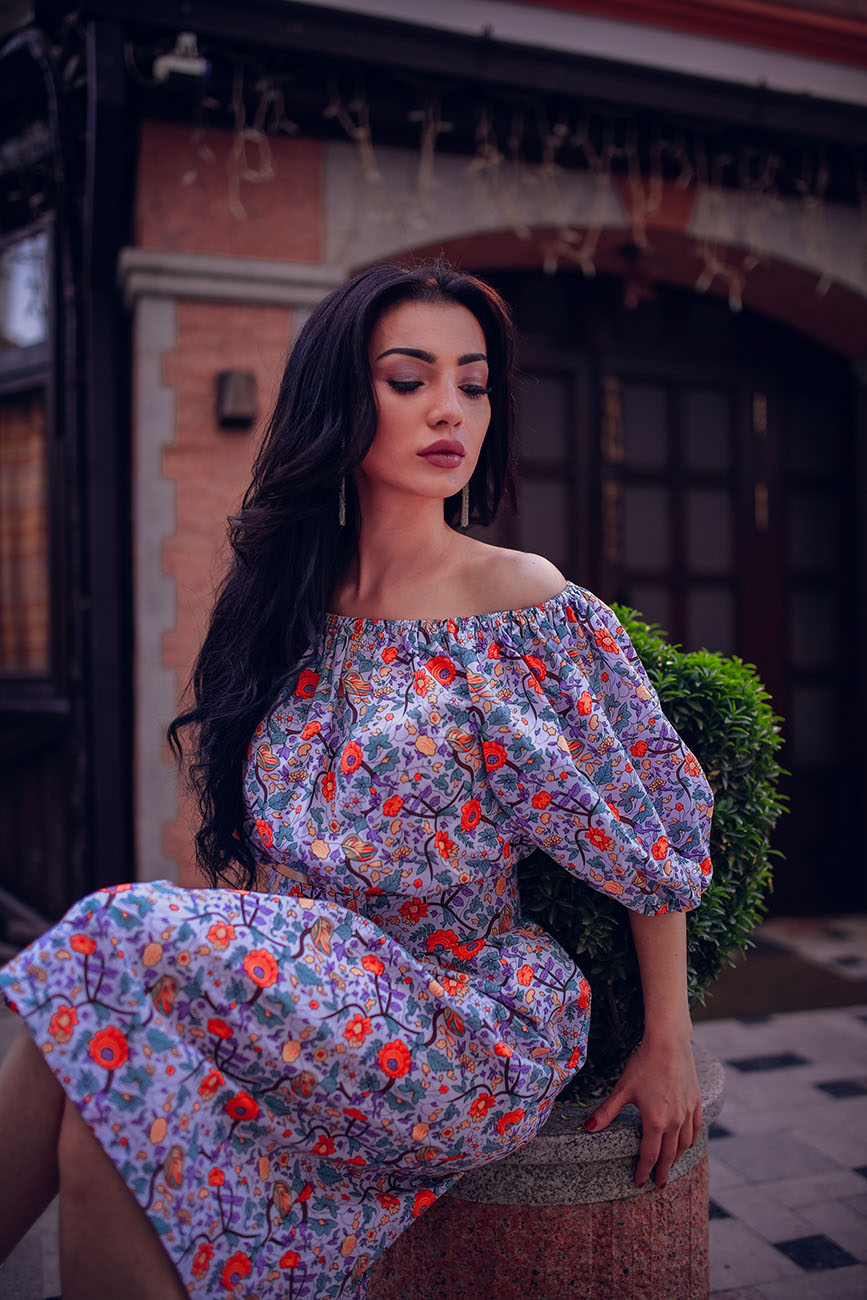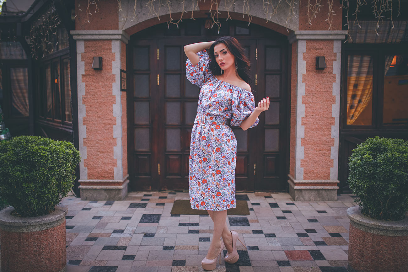 Открытые плечи – настоящий must-have сезона, который вскружил голову отъявленным модницам. Платье с вырезом «кармен» и рукавами-фонариками три четверти в стиле casual кокетливо оголит ваши плечи, акцентируя внимание на длинной шее и изящных руках. Фасон оптимален для стройных девушек любого роста с узкими и хрупкими плечами. Важная деталь – акцент на талии, который сбалансирует образ, избавив его от риска стать излишне объемным и бесформенным, а флористические мотивы, не выходящие из моды, добавят яркого «лета» образу.