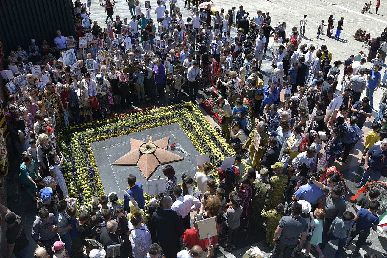 Утром 9 мая около 500 жителей столицы собрались в районе пивзавода и прошли маршем до самого парка Победы. Здесь они возложили цветы у Вечного огня в память об ушедших в Великой Отечественной Войне.