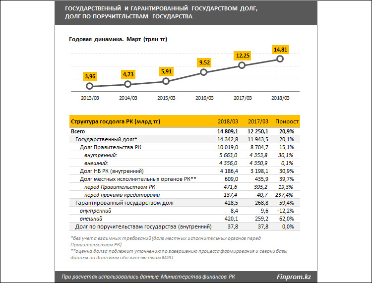 За последние 5 лет госдолг вырос в 3,9 раз, с $12,23 млрд до $45,25 млрд, что составило около 8% от внешнего долга Казахстана.