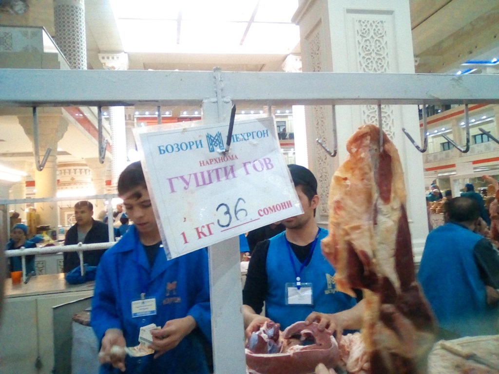 В правой стороне от входа за несколькими прилавками мы заметили торговлю мясом. Там тоже была вывеска «Мясо — 36 сомони». Мясо действительно имело не очень хороший товарный вид, жир с явно желтым оттенком, много прожилок и костей.