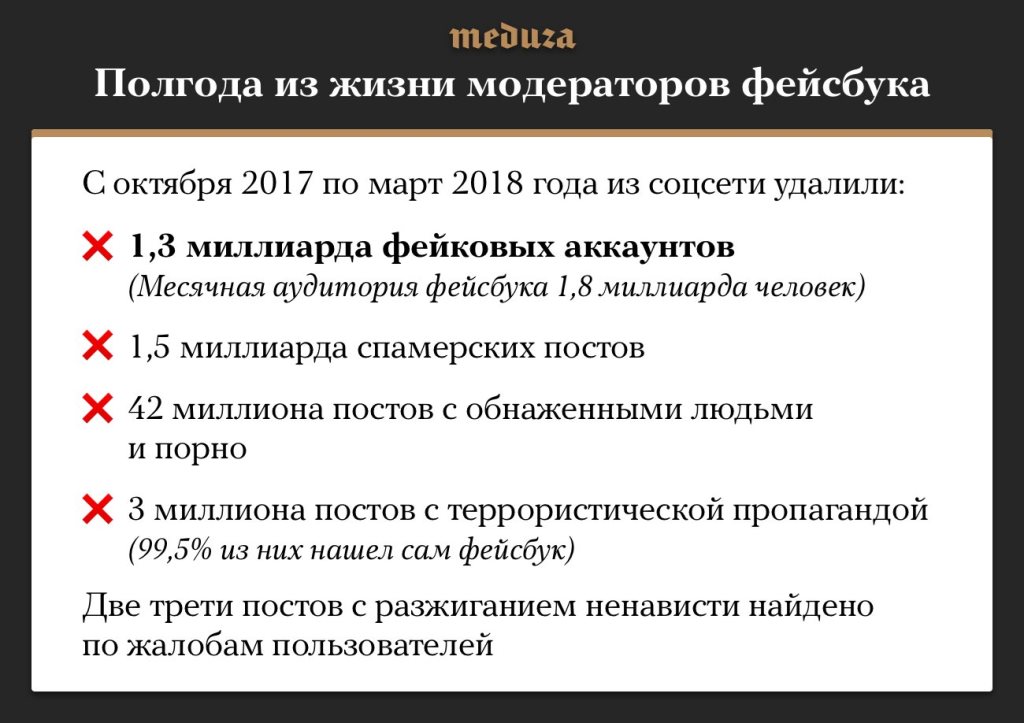 Чаще всего, утверждает Facebook, посты удаляются автоматически — еще до того, как на них успел кто-нибудь пожаловаться. Исключение — записи, разжигающие ненависть, где около 60-70% постов были удалены после жалоб пользователей.