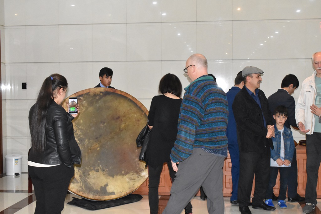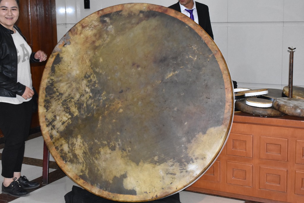 Диаметр дойры 1,5 метра и для ее изготовления, по словам мастера, ушло 28 дней. Для этого национального бубна с деревянной основой, понадобилась шкура одного крупного быка, ведь обычно сторона дойры затягивается кожной мембраной. Посмотреть и сделать селфи на фоне этого крупного экспоната пришли многие посетители, в том числе иностранцы.