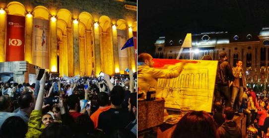 Затем митинг переместился к зданию парламента. Протестующие стали требовать отставки правительства Грузии, а также привлечения к уголовной ответственности Шотадзе и отца одного из подозреваемых, который работал в прокуратуре и, по мнению отца погибшего ребенка, покрывал убийц.