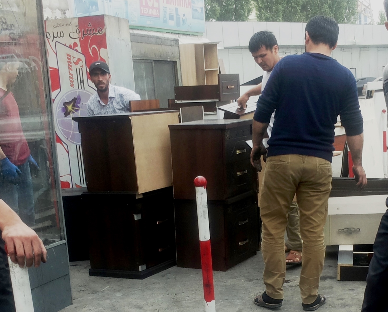 Прямо у основного входа выстроились в очередь несколько грузовых машин, куда торговцы выносят шкафы, диваны, кресла, бытовую технику. Почти все товары покрыты копотью.