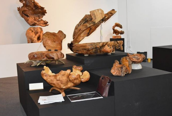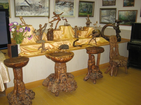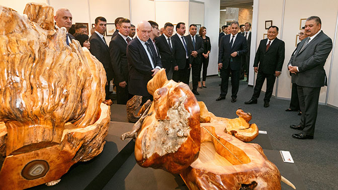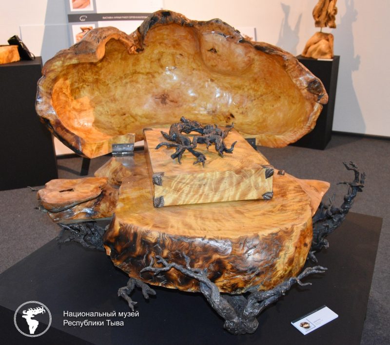 Личные художественные работы министра представлены публике впервые. В числе работ, выполненных из дерева — вазы, шкатулки, скульптуры. Республика Тува является родным регионом министра обороны России.