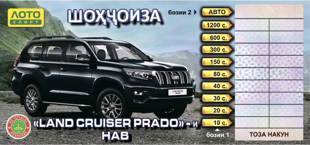 Билеты моментальной лотереи стоимостью 5 и 10 сомони хранят в себе небывалые суперпризы: LAND CRUISER PRADO выпуска 2018 года и МИЛЛИОН сомони.