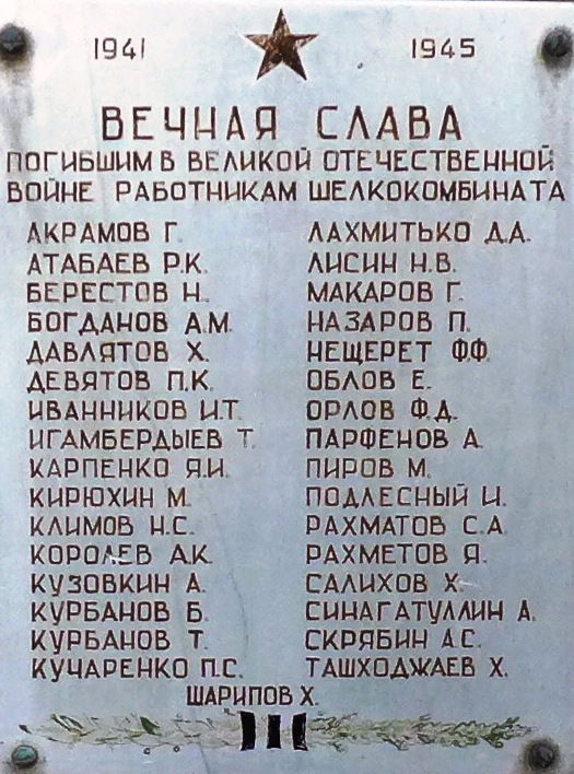 Еще в середине 50-х годов прошлого века на территории знаменитого на весь Союз шелкокомбината был создан небольшой мемориал рабочим и служащим, работавшим до войны на комбинате, ушедшим в годы ВОВ на фронт и погибшим на полях сражений.
