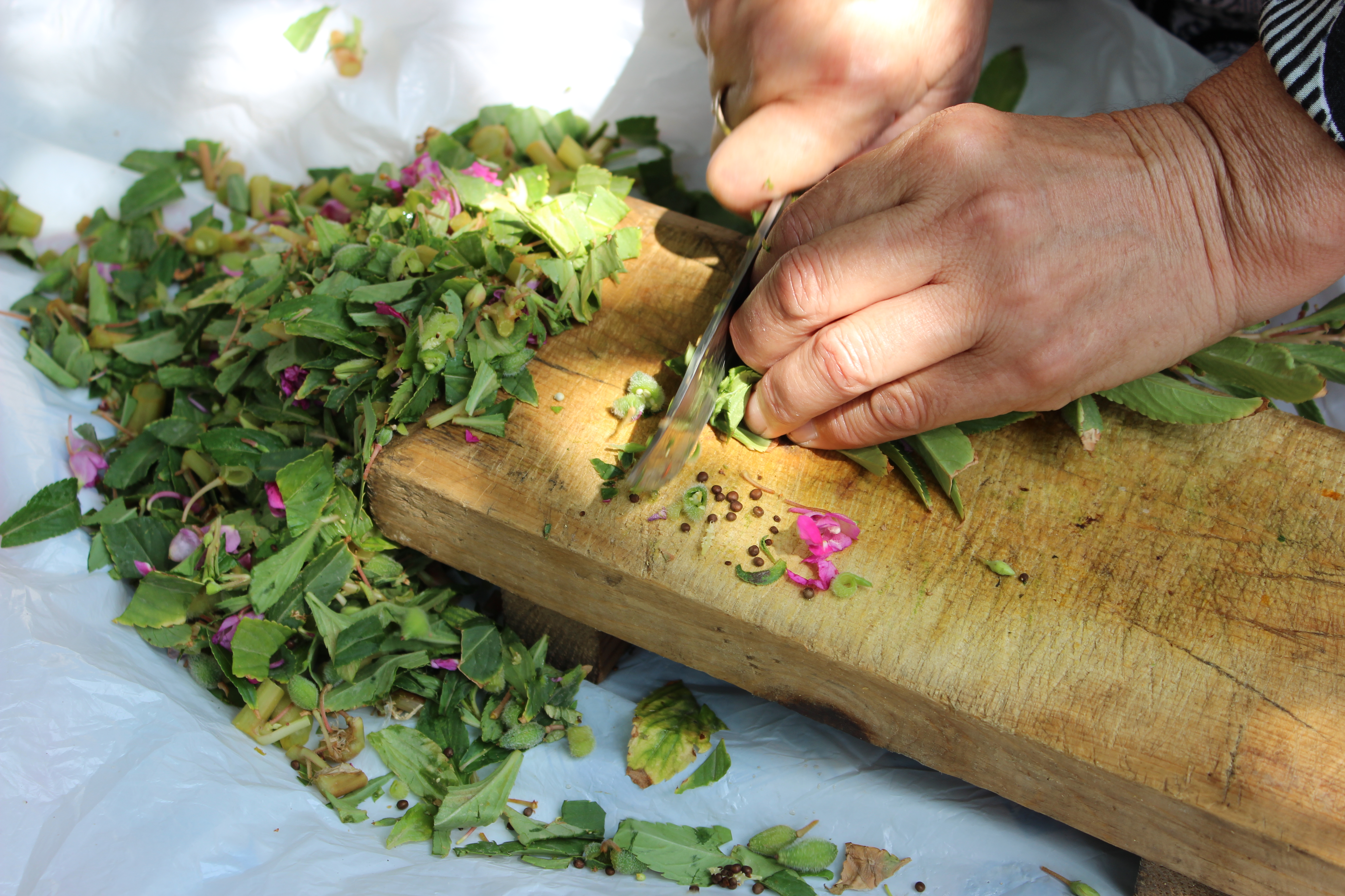 Если для окрашивания и укрепления волос и бороды, в основном, использовали сок, то саму толченую смесь применяли для окрашивания ступней ног, ногтей, ладоней. Смесь накладывалась на ладонь (или ступни), потом сгибался большой палец, затем — все остальные пальцы, образовывая тем самым кулачок, который обматывался целлофановым пакетом и хлопчатобумажной материей.