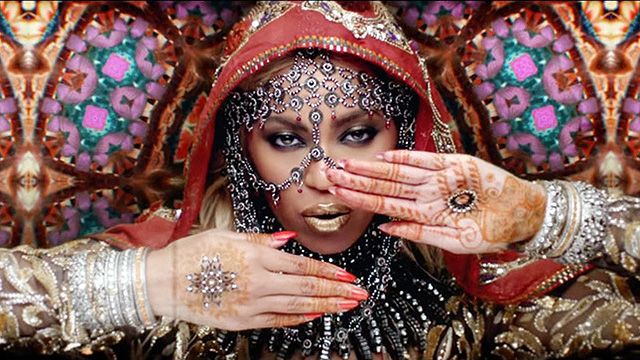 «И на ее шее, о, повелитель правоверных, была ладанка из червонного золота, которая спускалась между грудей, а на блюде ее лба был локон, подобный черной раковине, а брови ее сходились».