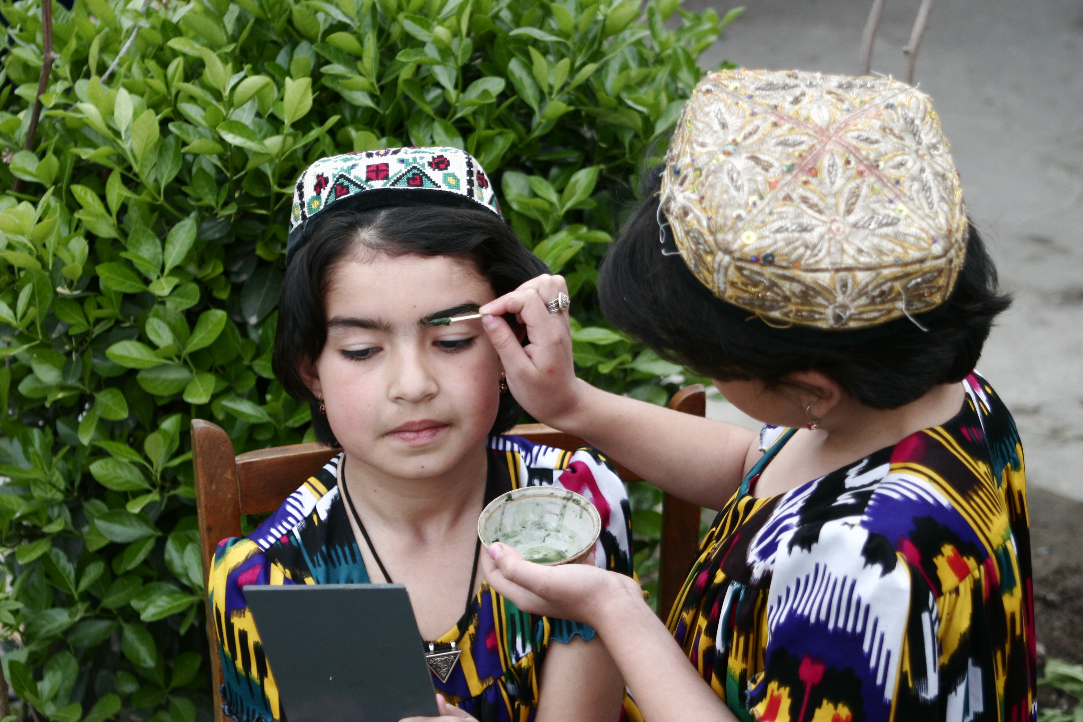 Если густые темные брови вошли в моду во всем мире только несколько лет назад, то в Таджикистане густые и даже сросшиеся на переносице брови всегда считались эталоном женской красоты. А чтобы они были чернее и гуще, с ранних лет все девочки красят брови соком усьмы — травянистого овощного растения из семейства горчичных, соединяя их над переносицей.