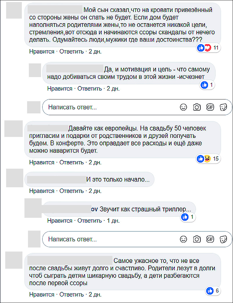 «Все вы правы, мебель, занавески, но поверьте, со стороны жениха тоже не просто это женитьба. Фотия (помолвка), сторона жениха должны дать деньги по $10 каждому, кого отправляют, в день свадьбы должны дать деньги за тупаланг ош (праздничный плов). Вещи родственникам, лайли (угощения, чаще выпечка, на подносах или в тазах), стороне невесты должны дать место на вечер 150-200 мест. Это тоже нехилые деньги. Лучше обе стороны договорились бы, камакак одамки Фотия (помолвку с маленьким числом участников), без мебель чизо (вещей), латта путто туй (без лишних трат). И на вечер уже молодежки туй (свадьба). Всем этого хочется, но почему то когда своя очередь доходит, никто так не поступает», — заключает комментатор.