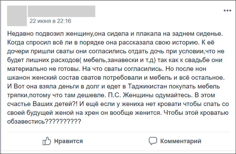 Пост был об истории женщины, которая, чтобы не расстроить свадьбу своей дочери, вынуждена влезть в долги и обеспечить ей солидное приданое. Автор поста возмутился обычаем предоставлять вещи стороне жениха, и многие участники группы его поддержали. Об актуальности проблемы свидетельствует то, что публикация набрала несколько сотен комментариев.