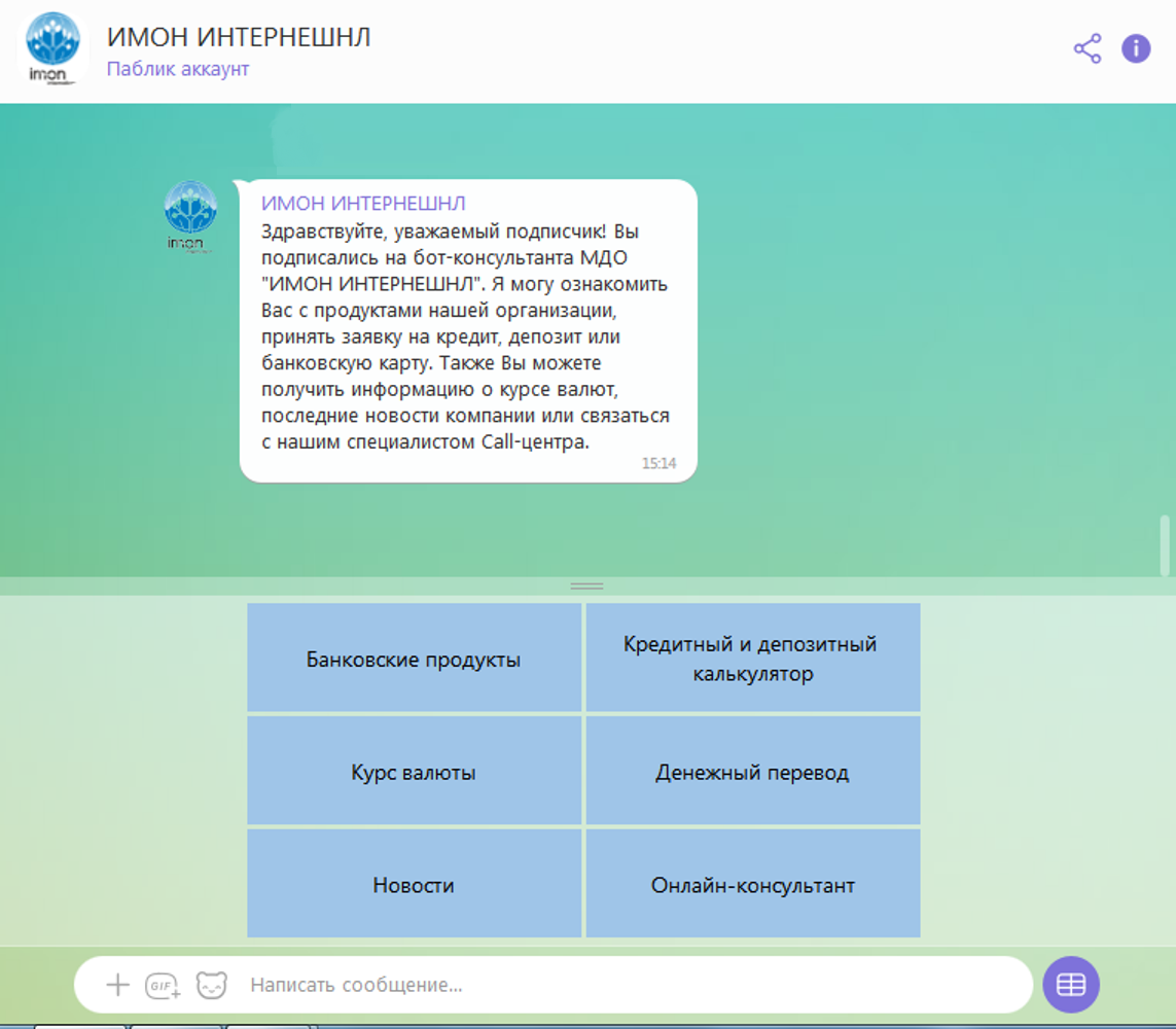 С помощью бота клиенты «ИМОН ИНТЕРНЕШНЛ» могут получить основную информацию о продуктах и услугах организации и совершать базовые финансовые операции прямо в интерфейсе социальной сети.