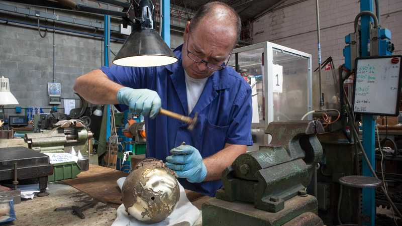 Создание кубка начинается с удаления излишков металла на специальном оборудовании. Затем он шлифуется, и с помощью молотка и стамеска, скульптор дополняет мелкие детали. Трофей тщательно полируется и помещается в специальную ванну, где он очищается под действием ультразвука, сообщает ca-news.org.