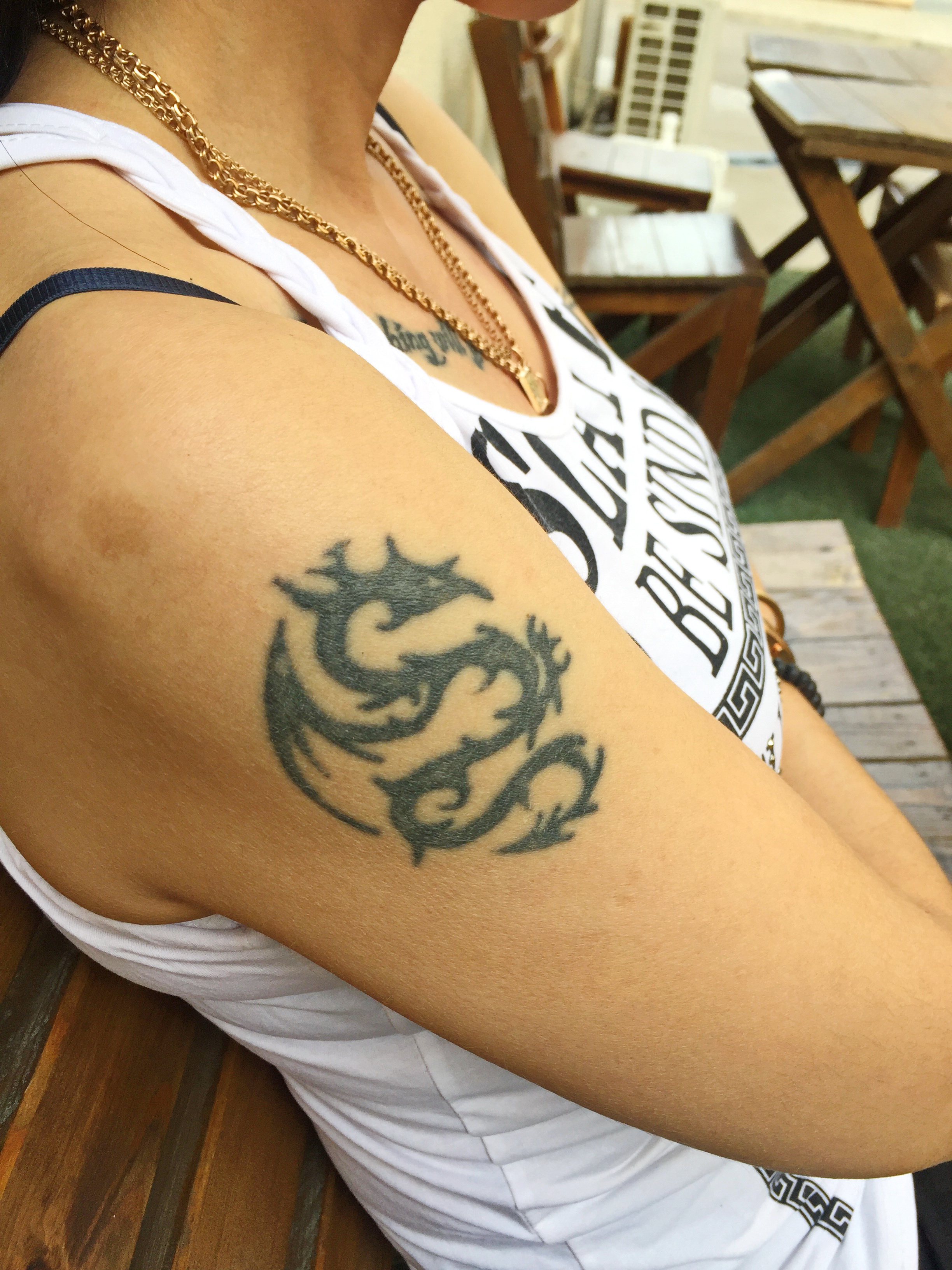 Первую татуировку Шоира сделала на плече. Это был дракончик. Таким образом, девушка хотела справиться с навалившейся на нее депрессией после перенесенного потрясения, связанного с разводом с любимым человеком: