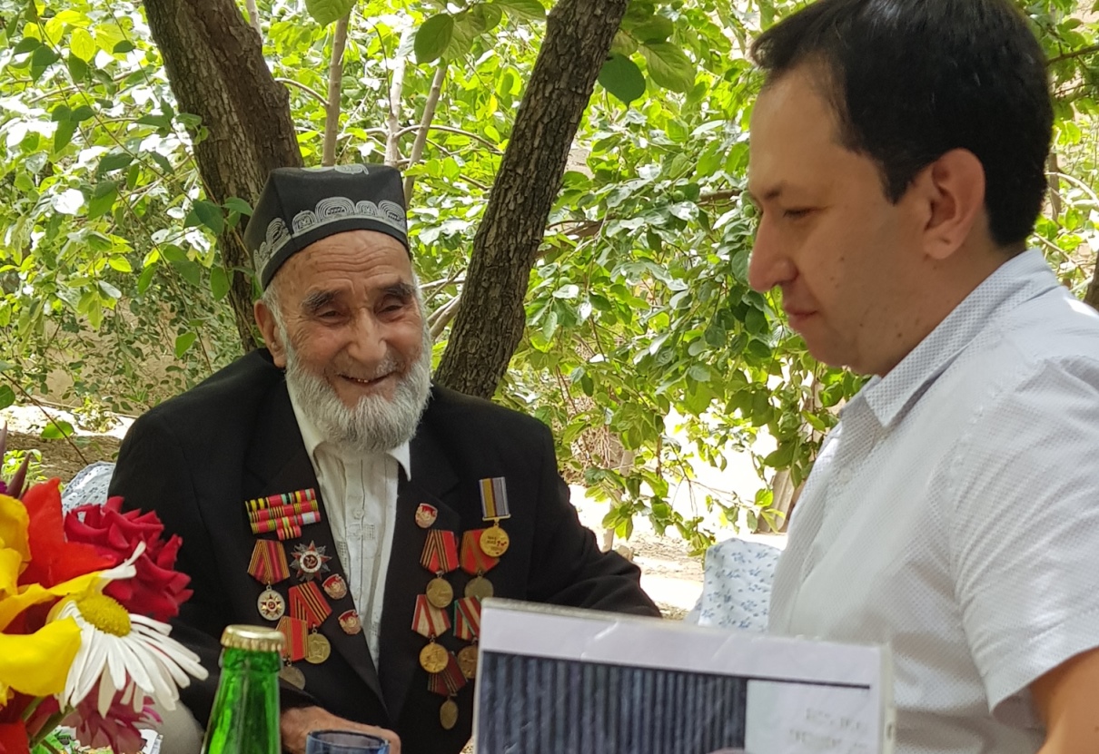Ветерану Николаю Голикову 98 лет, он выглядит немного уставшим, но «при параде» – надел все ордена. По словам зампредседателя Совета ветеранов района Сино города Душанбе Джамили Навидовой, все ветераны района готовились к встрече с представителями компании Samsung Electronics с большой тщательностью.