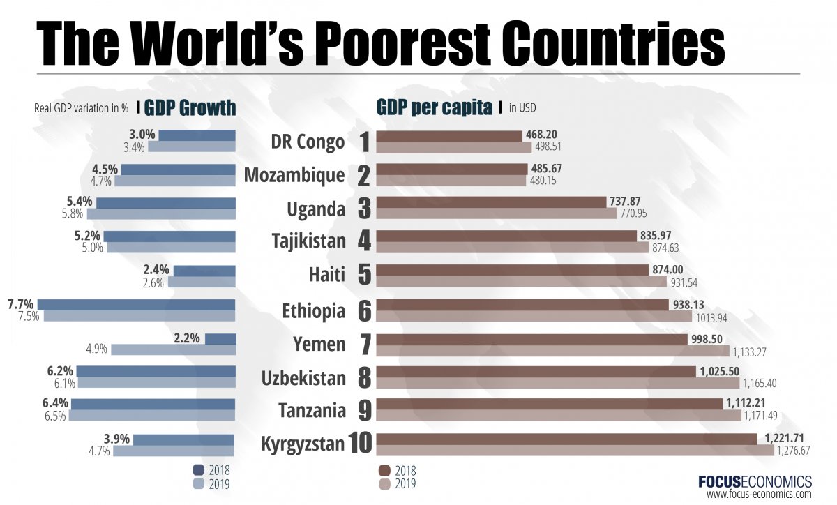 В социальных сетях разошлась инфографика Focus Economics, в которой Таджикистан находится на 4-ом месте среди беднейших стран мира по ВВП на душу населения.