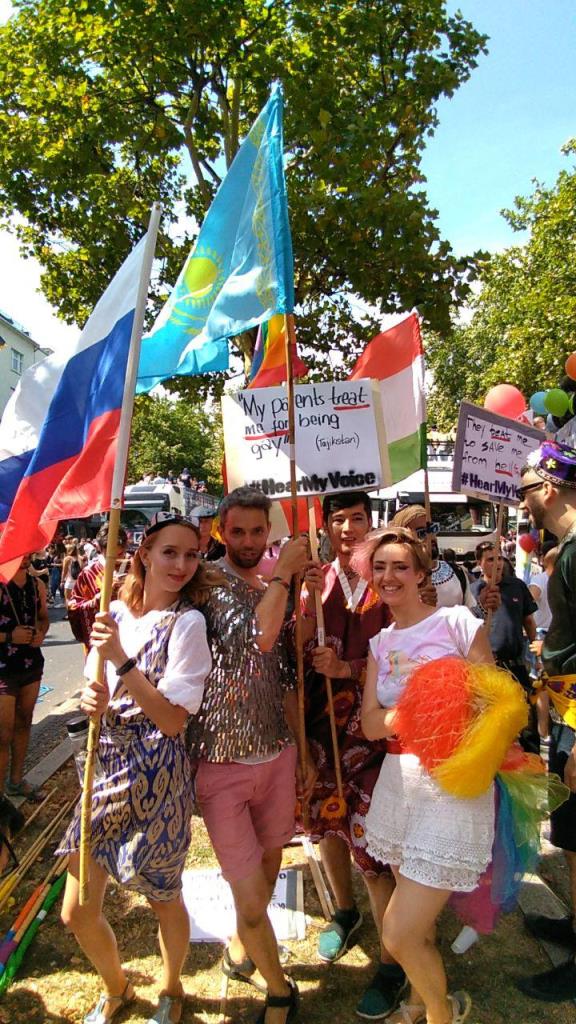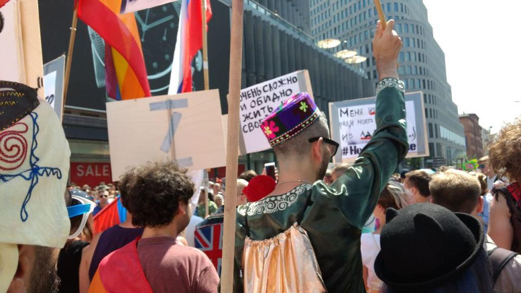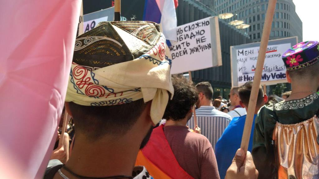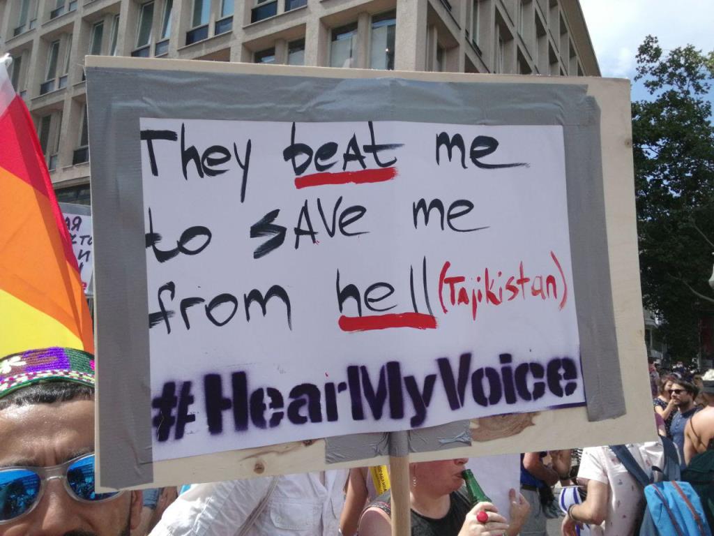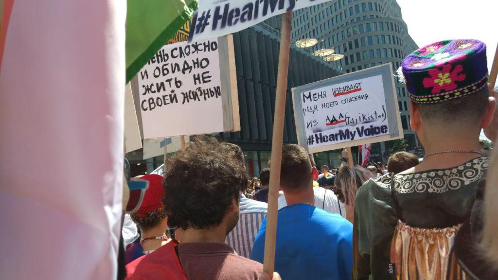 «Меня избивают ради моего спасения из ада. Tajikistan», «My parents treat me for being gay. Tajikistan» (Мои родители лечат меня, потому что я гей) — С такими плакатами участники гей-парада прошли по центру Берлина в эту субботу, 28 июля.