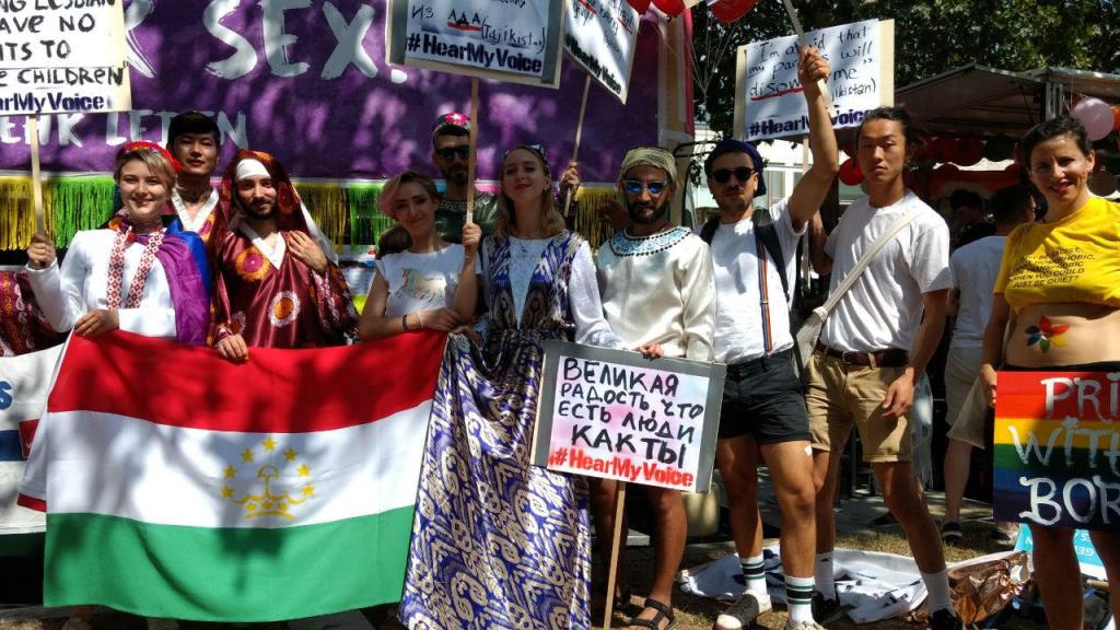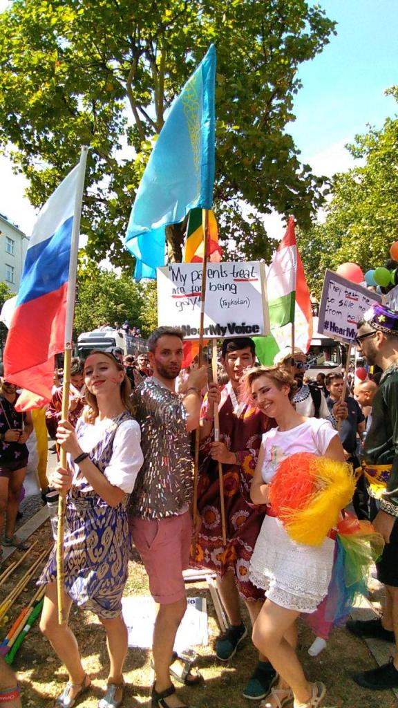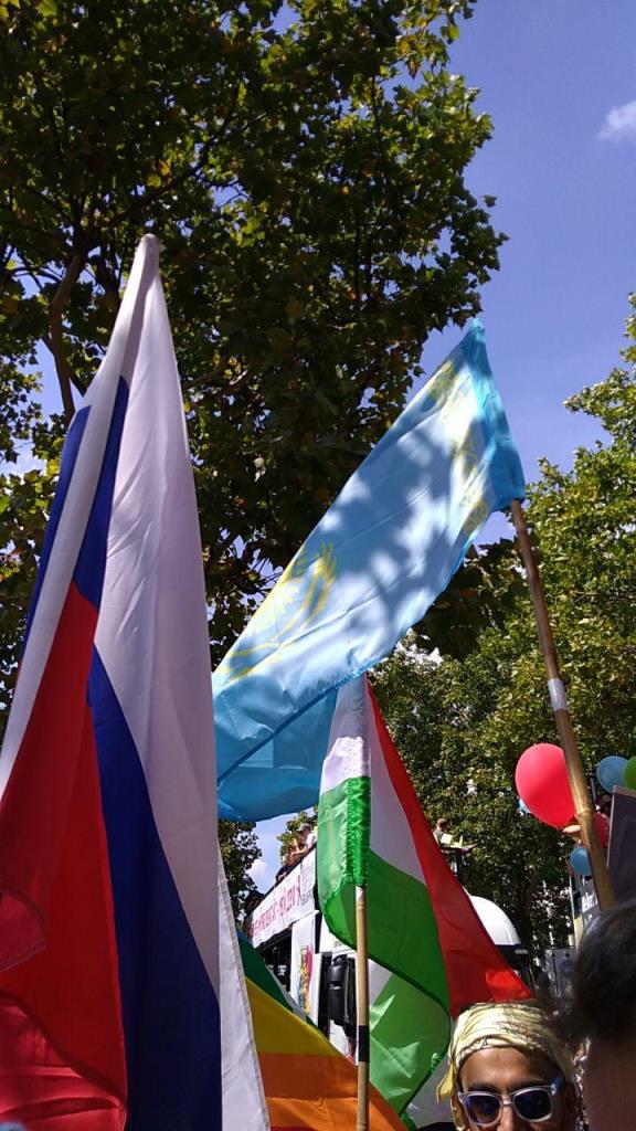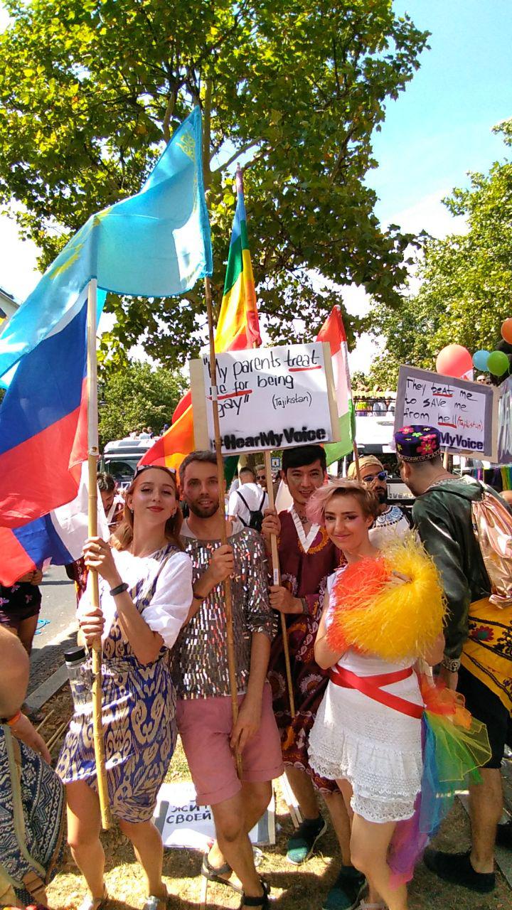 В эту субботу в центре Берлина прошел один из самых крупных гей-парадов в мире, среди участников мероприятия были и граждане Таджикистана, они были одеты в национальные таджикские костюмы и пронесли по улицам города флаг республики.