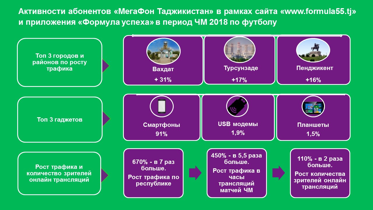 Как показывает статистика, более 90% абонентов компании «МегаФон Таджикистан» во время трансляций матчей ЧМ 2018 пользовались смартфонами, а остальные болельщики смотрели матчи с помощью планшетов и USB модемов. В рамках сайта «www.formula55.tj» и мобильного приложения «Формула успеха» рост интернет трафика во время проведения матчей ЧМ 2018 по всей республике составил 670% и это в 7 раз больше по сравнению с аналогичным периодом до старта ЧМ 2018. В среднем, в часы трансляций матчей, количество зрителей онлайн трансляций в период ЧМ 2018 увеличилось на 110%, в 2 раза больше.