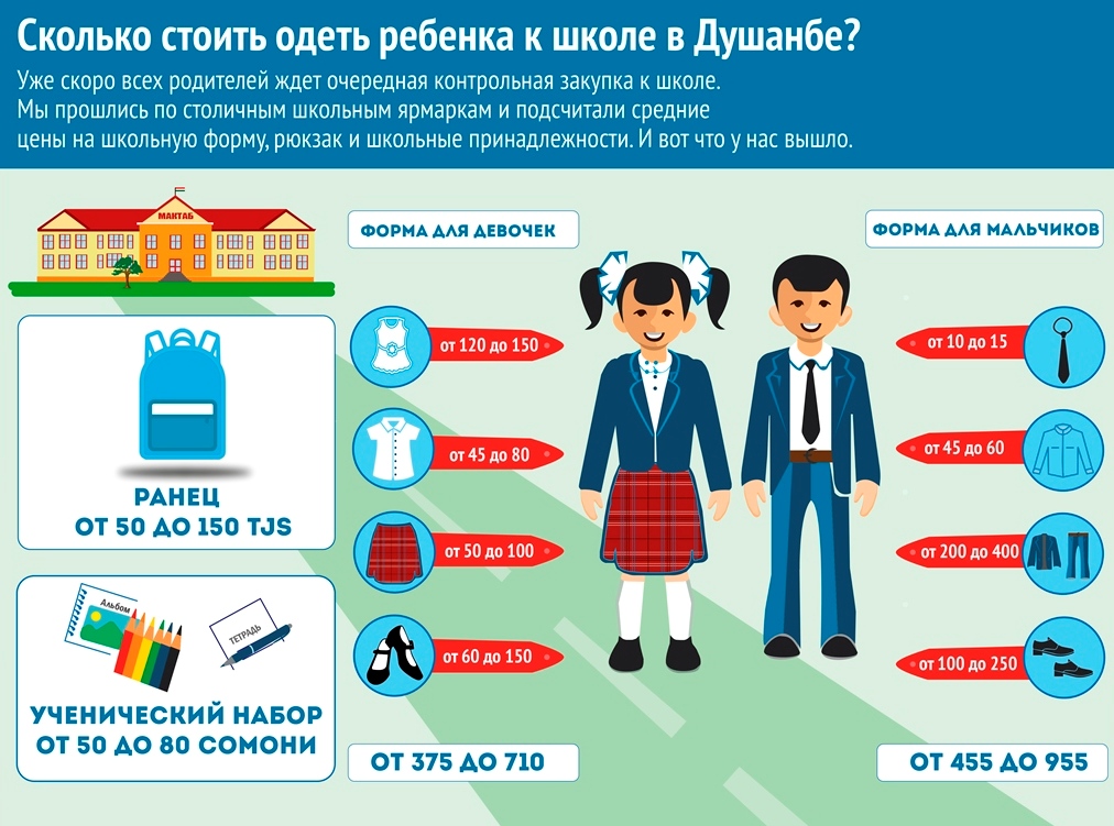 Цены мы узнавали на ярмарках по продаже школьных принадлежностей и одежды, которые проводятся с 6 по 31 августа во всех столичных районах: в районе Исмоили Сомони при торговом центре «Мехргон», в районе Шохмансур при ТЦ «Ёкут-2000», в районе Фирдавси – на стоянке рынка «Ганджина» и в районе Сино при ТЦ «Ёвар».