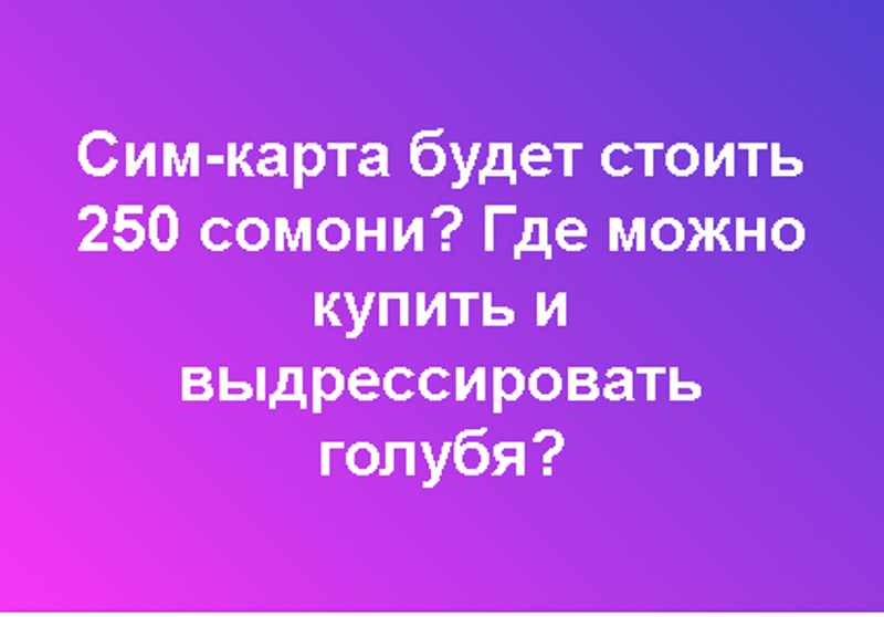 В общем, Служба связи собирается установить плату за сим-карты мобильных компаний в размере 250 сомони ($26). Да, вот такая вот … (слово можете подобрать сами). Когда будете подбирать, имейте в виду, что сейчас сами сим-карты ничего не стоят: абоненты приобретают их вместе с пакетом услуг. И не забудьте, что платных сим-карт нет уже практически нигде в мире, — мы в редакции смогли вспомнить только Турцию.