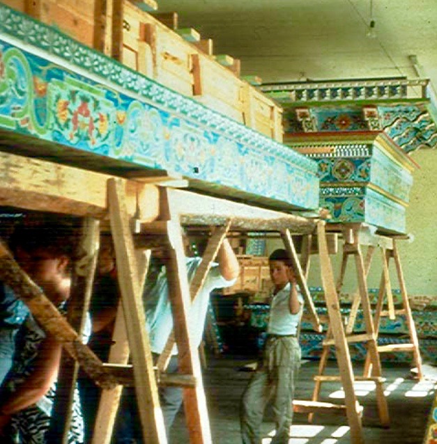 Подспорьем чайханы Душанбе стали 12 вырезанных кедровых колонн, каждая из которых была уникальной по своей резьбе и рисунку. В создании декора не использовались электроинструменты, работа велась вручную точно так же, как это создавалось много веков назад. Все элементы будущей чайханы были разбиты на 2343 части и упакованы в 200 ящиков. Каждый элемент тщательно маркировался и вносился в каталог на таджикском языке для повторной сборки в городе Боулдер.