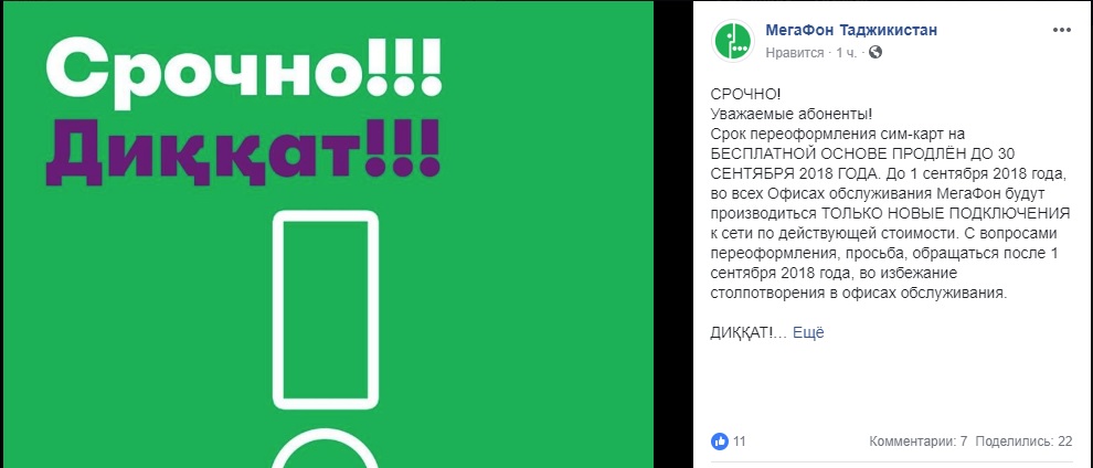 В частности, компания Мегафон Таджикистан на своей официальной странице в Facebook разместила срочное объявление.