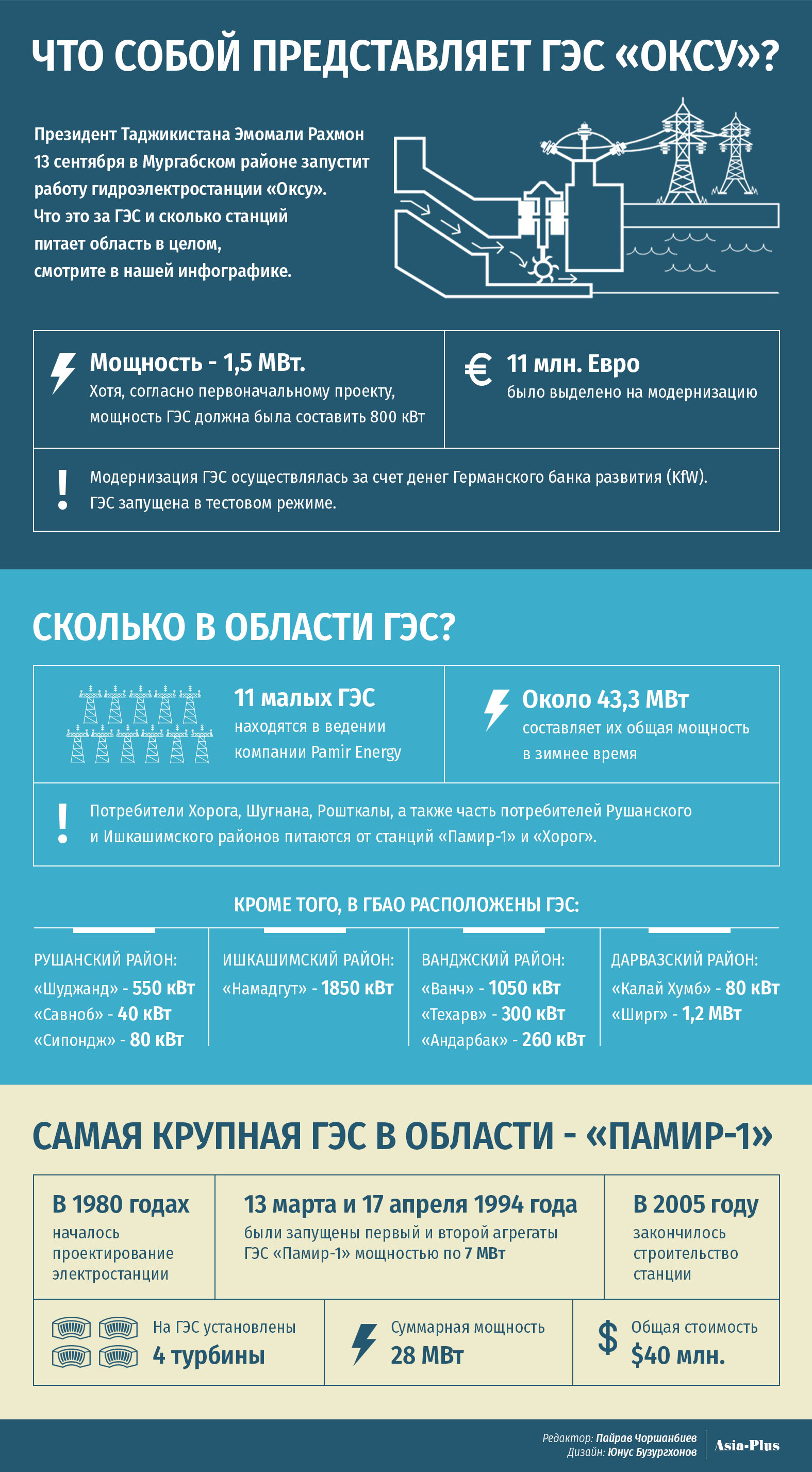 Проект модернизации ГЭС «Оксу» финансируется Германским банком развития (KfW). Согласно первоначальному проекту, мощность будущей ГЭС должна была составить 800 кВт/ч, и на эти цели предусматривалось выделение 4 млн. Евро.