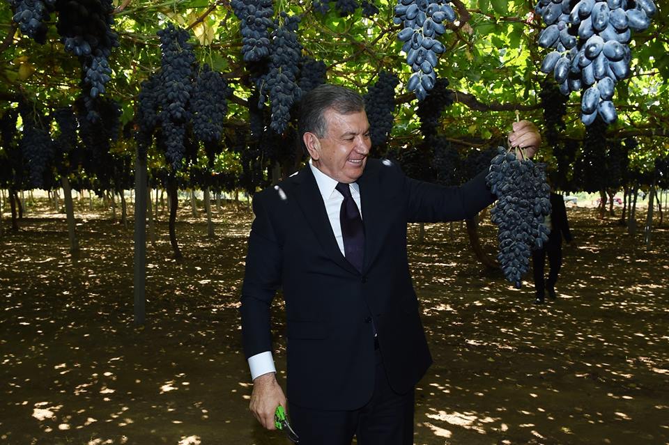 Главы Таджикистана Эмомали Рахмон и Узбекистана Шавкат Мирзиеев в Турсунзаде ознакомились с состоянием виноградарского хозяйства «Боги Сомон», которое раскинулось на площади 500 гектаров.