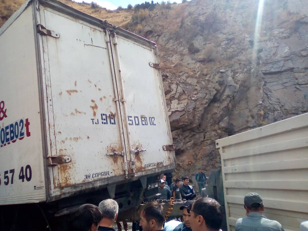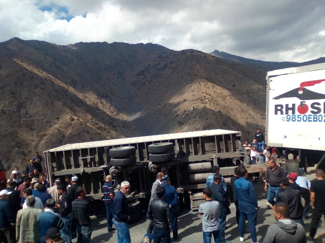 По их словам, на въезде в тоннель «Шахристан» водитель Камаза (госномера 9850 ЕВ02) на повороте не справился с управлением транспорта, и автомашина врезалась в гору. В результате, прицеп грузовика перевернулся, и перекрыл дорогу.