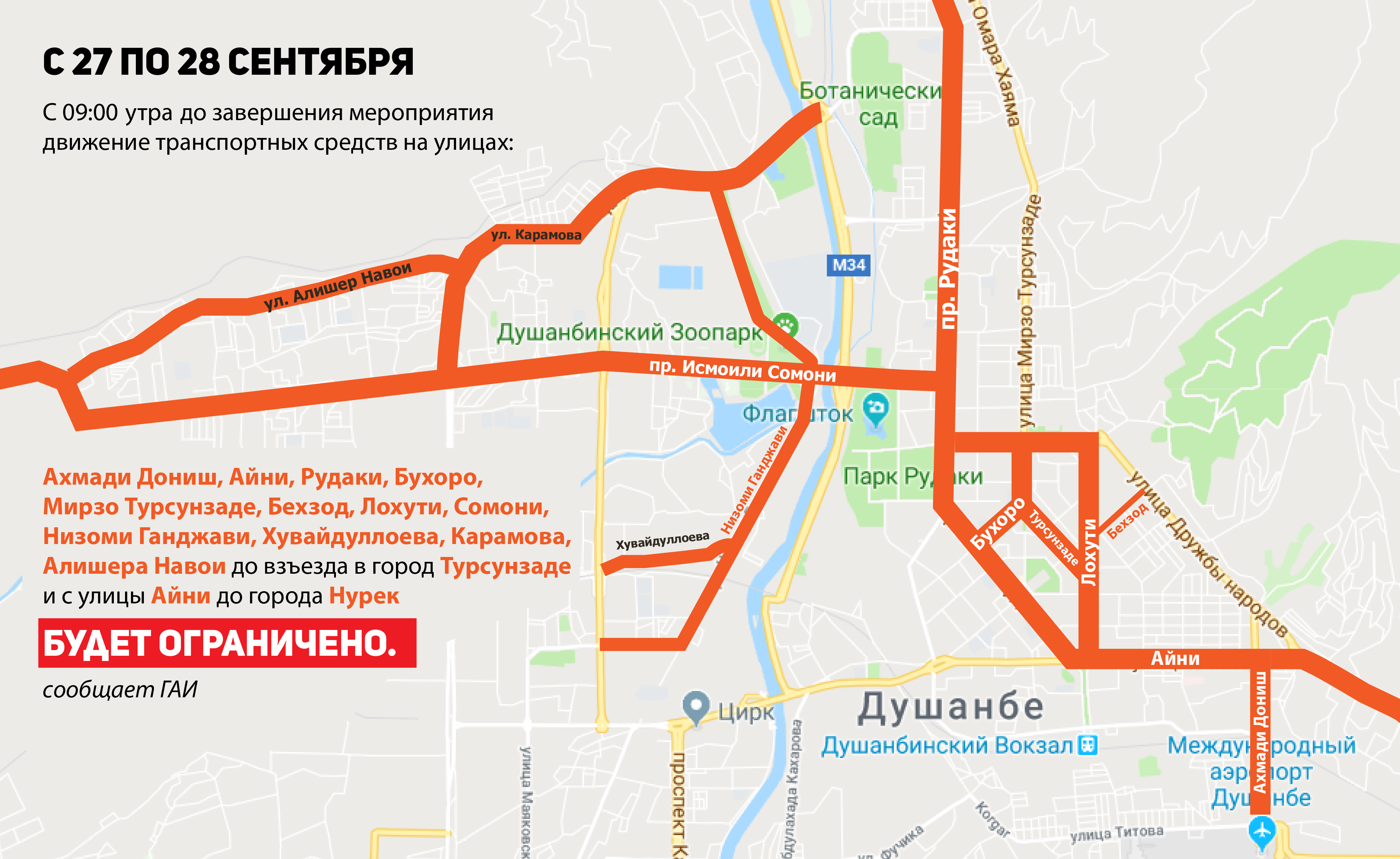 В течение двух дней движение транспортных средств будет ограничено на улицах Ахмади Дониш, Айни, Рудаки, Бухоро, Мирзо Турсунзаде, Бехзод, Лохути, Сомони, Низоми Ганджави, Хувайдуллоева, Карамова, Алишера Навои до взъезда в город Турсунзаде и с улицы Айни до города Нурека, сообщает ГАИ.