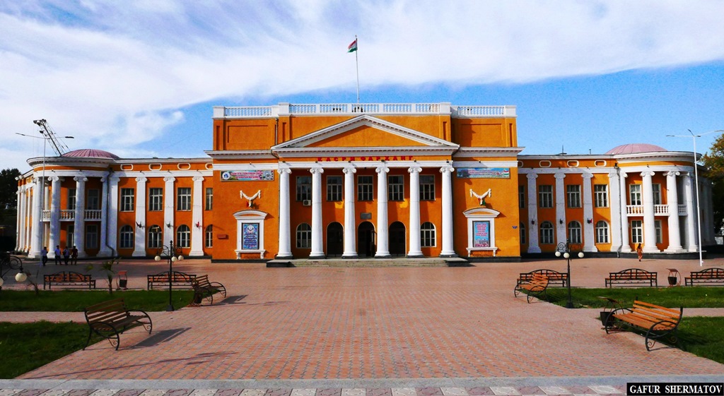 Здание драматического Театра им. Камола Худжанди (арх. С. В. Волков) отделанное терразитовой штукатуркой является примером умелого применения традиционных и национальных форм архитектуры.