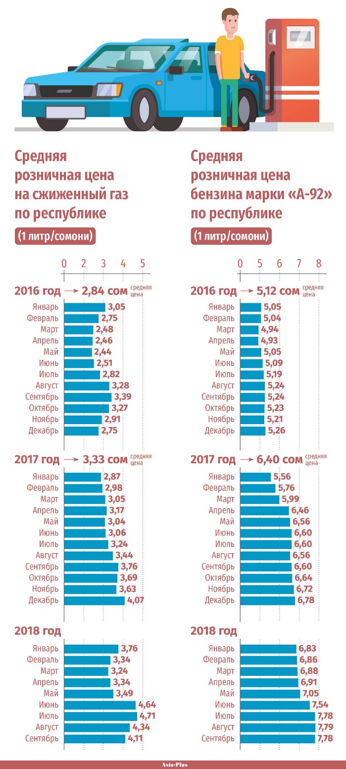 За три года стоимость сжиженного газа в республике выросла с 2,84 до 4,11 сомони, бензин подорожал с 5,12 до 7,78. Вот график роста цен.
