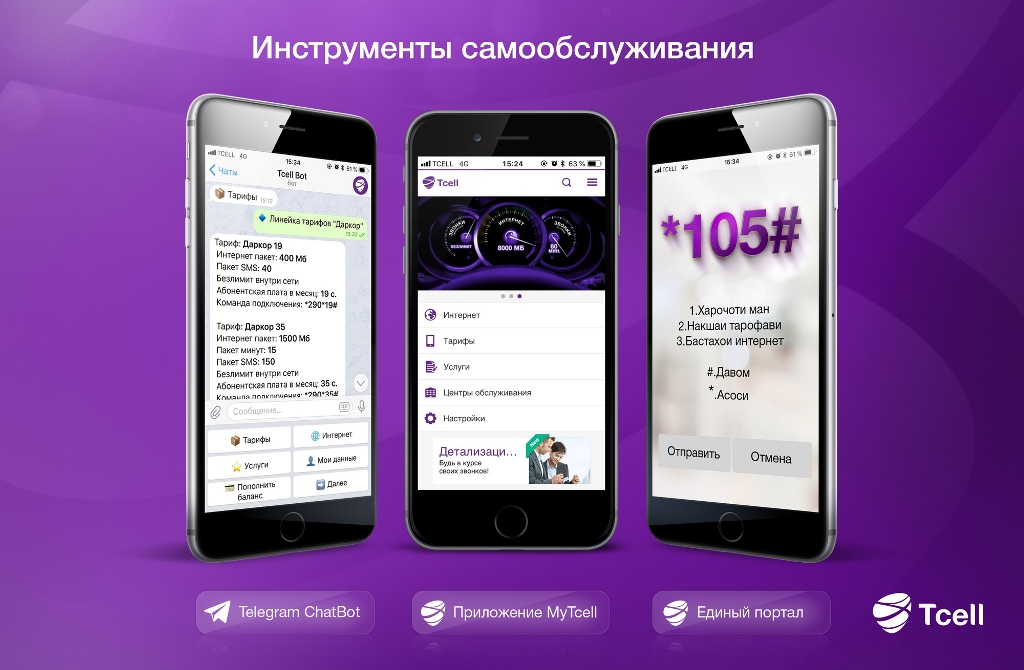 Самые эффективные инструменты самообслуживания от Tcell на сегодняшний день – это приложение Мой Tcell, единый информационный портал *105#, и Чат-бот в мессенджере Telegram.