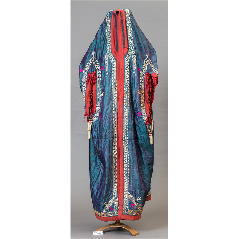 Костюм кочевых и полукочевых народов Средней Азии: каракалпаков, казахов, киргизов и узбеков, помнящих родоплеменное деление, — существенно отличался от костюма равнинных таджиков и узбеков, жителей оазисов. Он был более сложным, многоярусным. Женский праздничный наряд казашки или киргизки производил впечатление монументальной роскоши — пышный и многослойный, щедро украшенный вышивкой и всевозможными серебряными подвесками, монетами, кораллами и жемчугом, он превращал женщину в величественное изваяние. Самой поразительной деталью женского костюма были казахские и каракалпакские свадебные головные уборы — саукеле. Казахское саукеле имело конусообразную форму, напоминающую высокую башню, устремленную в небеса. Каракалпакский свадебный головной убор походил на шлем древней воительницы.