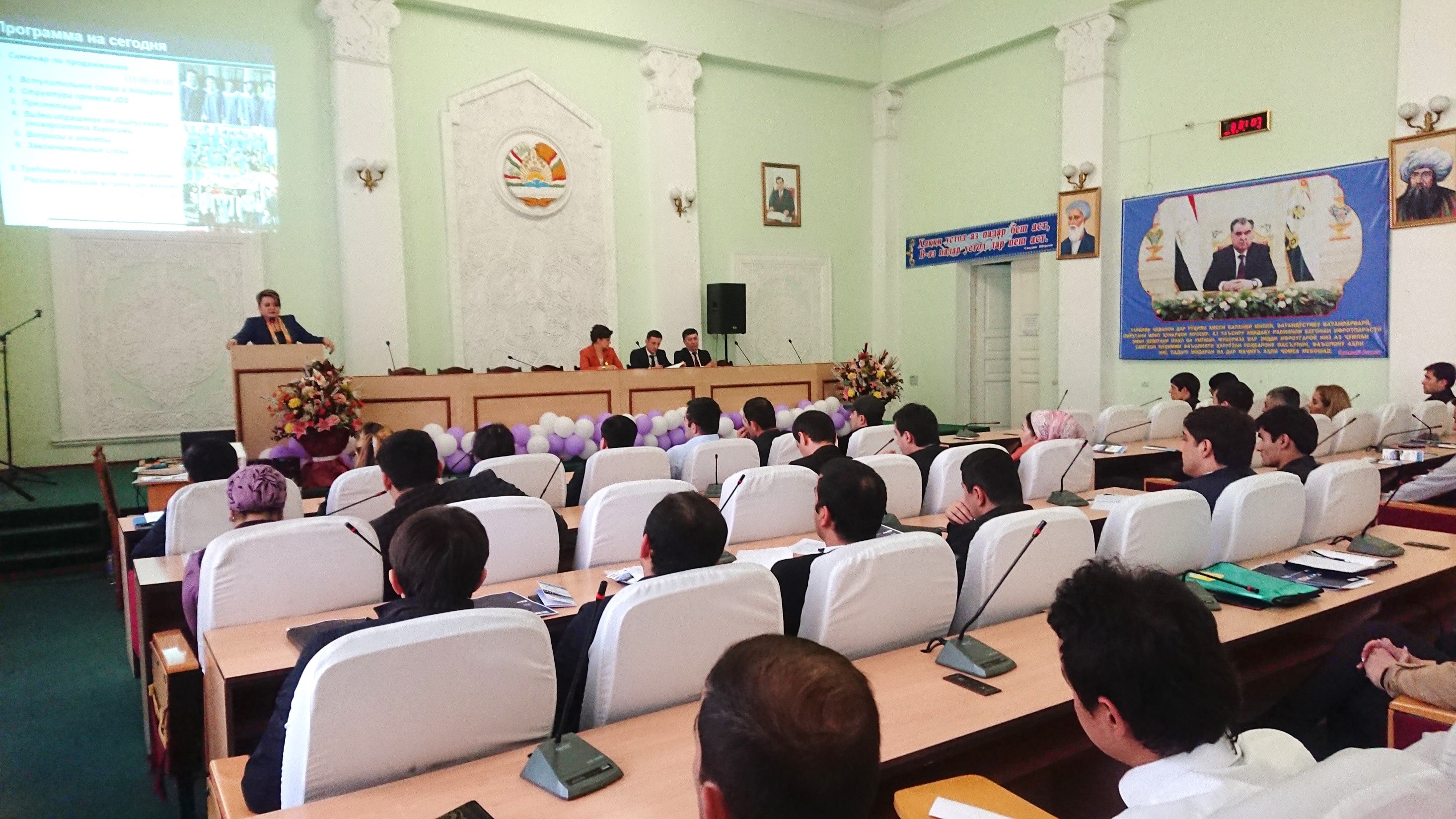 На семинаре по продвижению проекта и разъяснительной встрече для женщин, заместитель директора АГС г-жа Аюби поприветствовала всех потенциальных кандидатов и мотивировала их принять активное участие в проекте. В основной части семинара два выпускника проекта JDS, а именно г-жа Амонзода Ширин из Комитета по развитию туризма и г-н Кимсанов Дилшод из Агентства по мелиорации и ирригации, представили свои академические достижения и поделились своими опытами, полученными в Японии, а также рассказали про свои карьеры после возвращения в Таджикистан. Заключительное слово было предоставлено г-ну Хидеки Танабе, Главе представительства JICA в Таджикистане, где он вдохновил участников на то, чтобы они рассмотрели свое участие на проекте как шанс расширить своё мировоззрение и своё мнение о японской культуре, а также получить отличные знания для содействия развитию своей страны.
