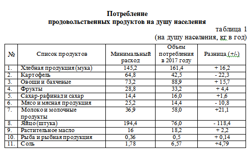 хлебная продукция — 145,2 кг, картофель — 64,8 кг, овощи и бахчевые — 73,2 кг, фрукты — 28,8 кг, сахар — 14,4 кг, мясная продукция — 25,2 кг, рыба — 5,8 кг, молочная продукция — 36,9 кг, яйца — 194,4 штук, масла – 16 кг, другие продукты (соль, чай, ароматизаторы) — 0,36 кг.