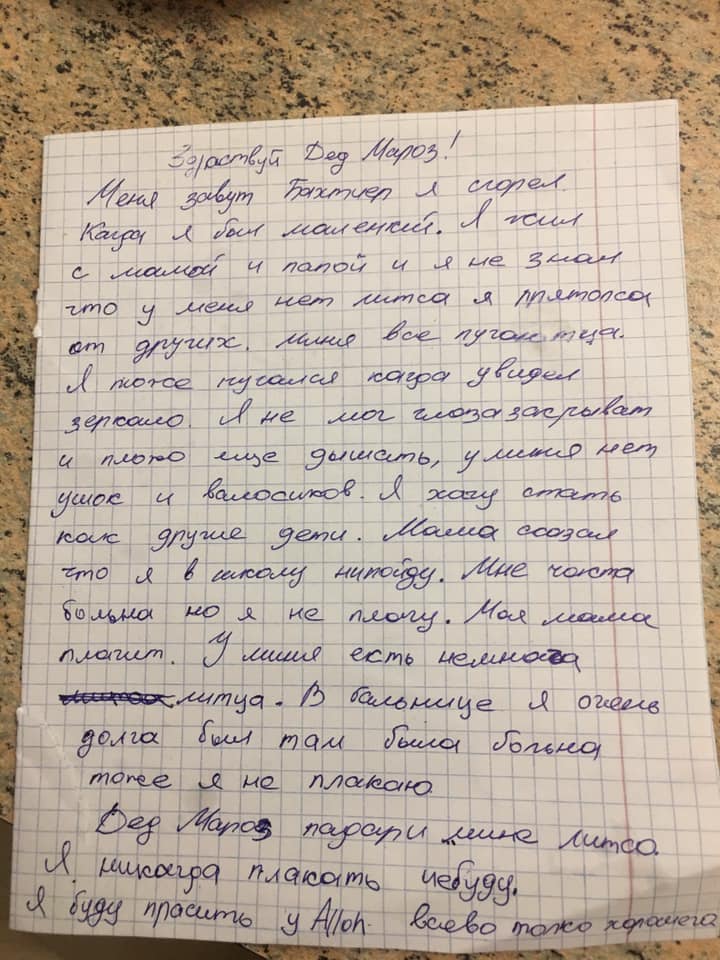 «Здравствуй, Дед Мороз! Меня зовут Бахтиер, я сгорел когда был маленький. Я жил с мамой и папой и не знал что у меня нет литца я прятолся от других. Меня все пугаютца. Я тоже пугался когда увидел зеркало. Я не мог глаза закрыват и плохо еще дышать, у меня нет ушок и валосиков. Я хочу стать, как другие дети. Мама сказал что я в школу нипойду. Мне часта больна но я не плачу. Моя мама плачит. У меня есть немнога литца. В больнице я очень долго был там была больна, тоже я не плакаю. Дед Мороз, подари мне литцо. Я никогда плакать небуду. Я буду просить у Alloh всево тоже хорошего» (орфография и грамматика сохранены).