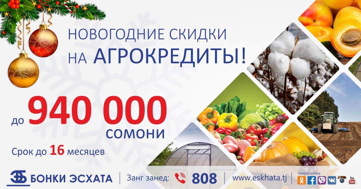 Специально для дехкан предлагаются кредиты на льготных условиях: до 940 000 сомони сроком до 16 месяцев. Предлагается льготный период до 12 месяцев, в течении которого у Вас есть возможность выплачивать только проценты.