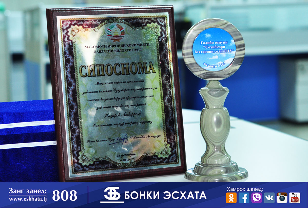 По итогам 2018 года «Банк Эсхата» признан Лучшим предпринимателем 2018 года в областном конкурсе «Сохибкори бехтарини соли 2018». Торжественная церемония вручения состоялась 21 декабря 2018 года во Дворце культуры «Сугдиён» города Худжанда, организованная по инициативе Председателя области Раджаббой Ахмадзода с целью поддержки предпринимателей, способствующим развитию экономики и общества, повышению уровня производства и сферы услуг. На […]