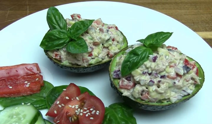 Измельчите каперсы, оливки, лук и сельдерей. Разомните вилкой тунца, добавьте остальные ингредиенты, заправьте майонезом. Полейте все соком половины лайма. Авокадо разрежьте пополам, удалите косточку и полейте соком лайма. Половинки авокадо наполните приготовленной смесью. Охладите в холодильнике и подавайте.