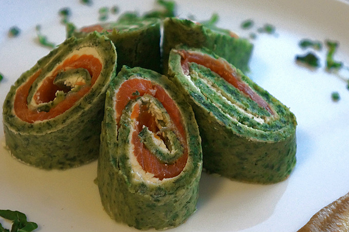 Семгу порезать тонкими ломтиками. Смешать рыбу и сливочный сыр. Выложить начинку на блинчик, распределить ее ровным слоем толщиной около 1 см. Свернуть блин в рулет и нарезать его небольшими порционными кусочками.