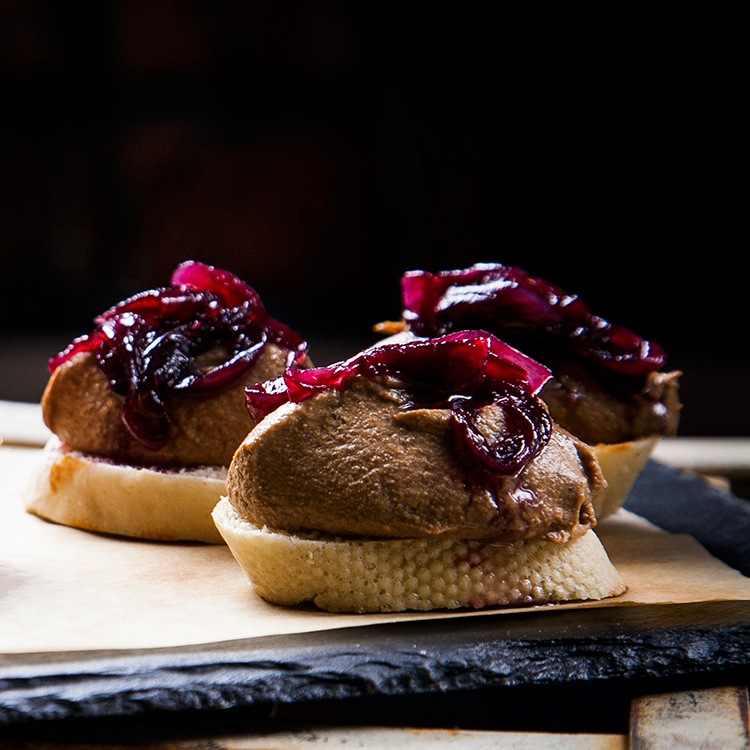 Взбейте печень и лук блендером до гладкости. Верните обратно в сковороду, влейте немного куриного бульона и уварите до достижения желаемой консистенции. Посолите и поперчите. Хлеб нарежьте ломтиками и подсушите в духовке или на сковороде без добавления масла. По желанию натрите долькой чеснока и подавайте вместе с паштетом.