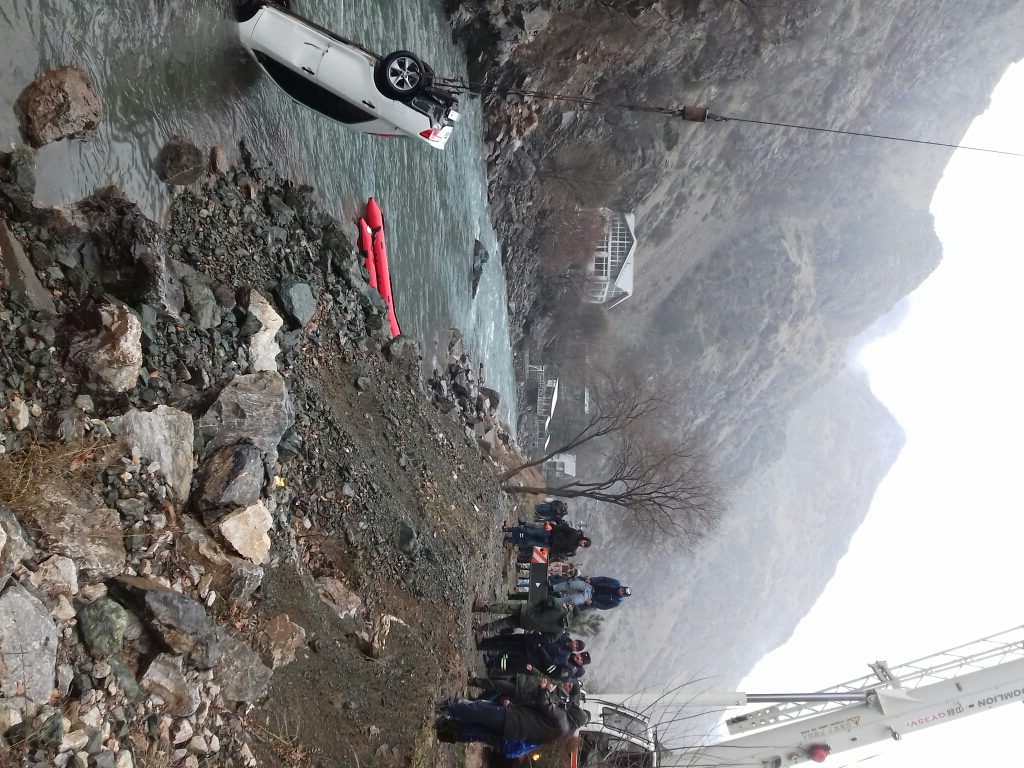 Автомобиль, пролетев 3-4 метра, упав в реку, оказался на глубине 1,5 — 2 метра. К моменту прибытия спасателей машина была в середине реки, по крышу погруженная в воду. В результате аварийно-спасательной операции водитель и двое его пассажиров были извлечены. Они не пострадали, отделались испугом и промокли, сообщает пресс-секретарь КЧС Умеда Юсупова.